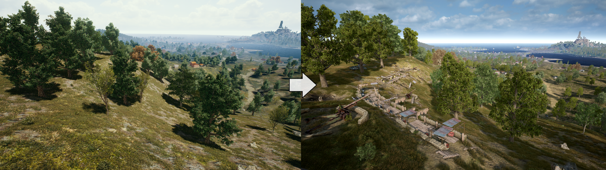 - 我们在整张图中增加了战壕、爆炸痕迹、伪装和废弃坦克。