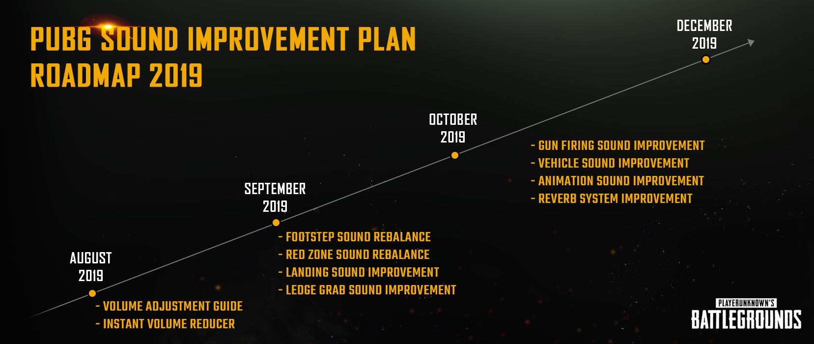 以8月份和9月份的PUBG音效环境与平衡性改版为起点,今年我们还对音效有着长期的改版计划,这里就简单地跟各位分享一下我们的长期改版计划和改版的方向性。