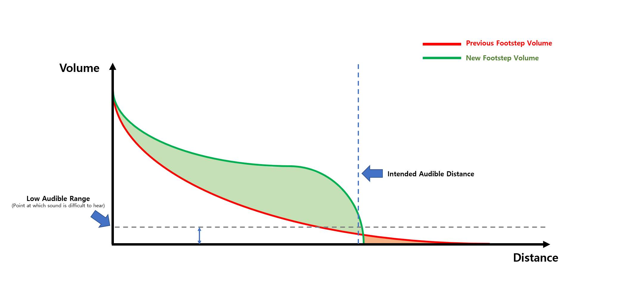 对此,我们将对脚步声的音量重新进行平衡性调整,并按下图所示,减少脚步声传播范围内的音量下降幅度;而处于该范围外的玩家无论如何放大音量都将无法听到该脚步声。