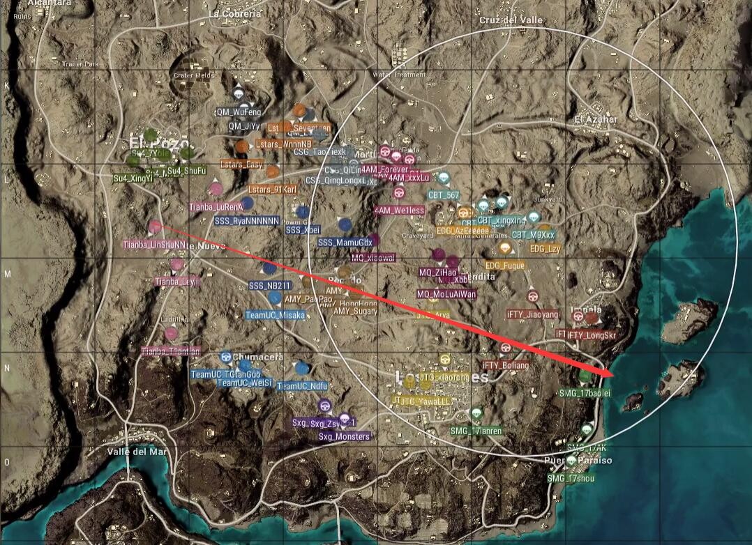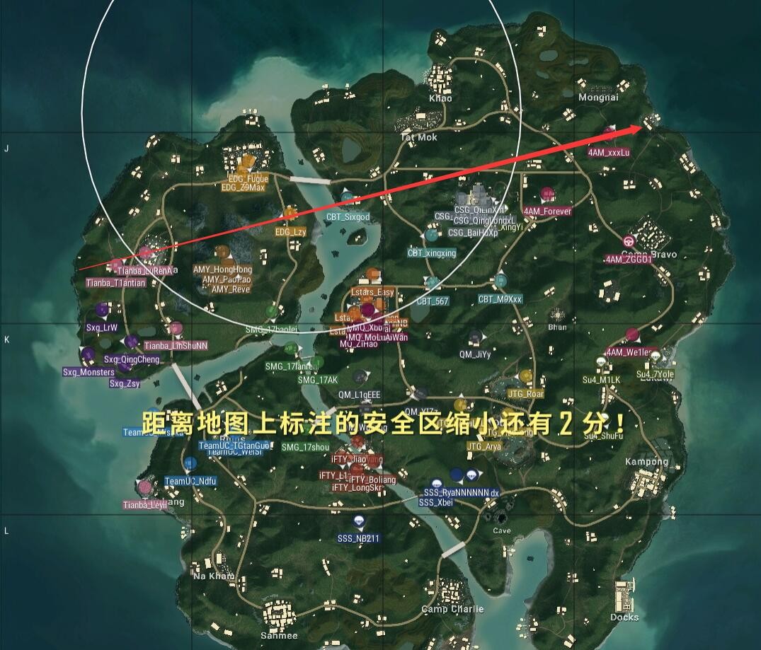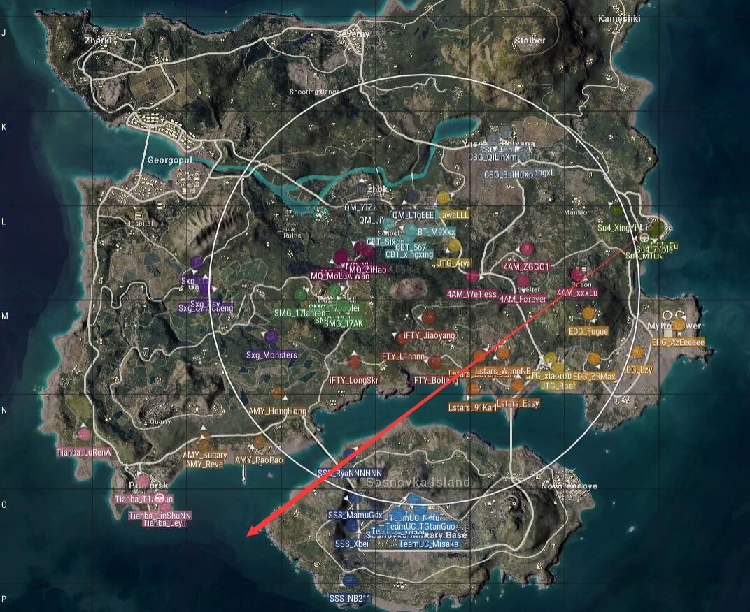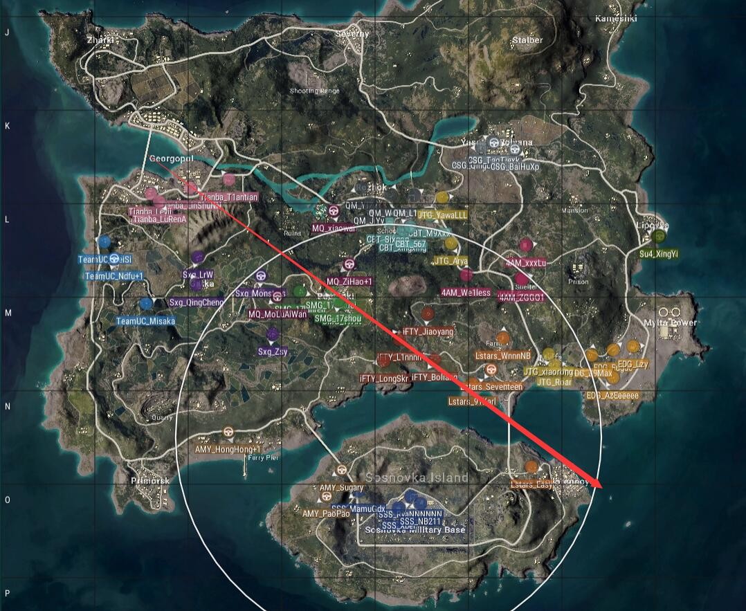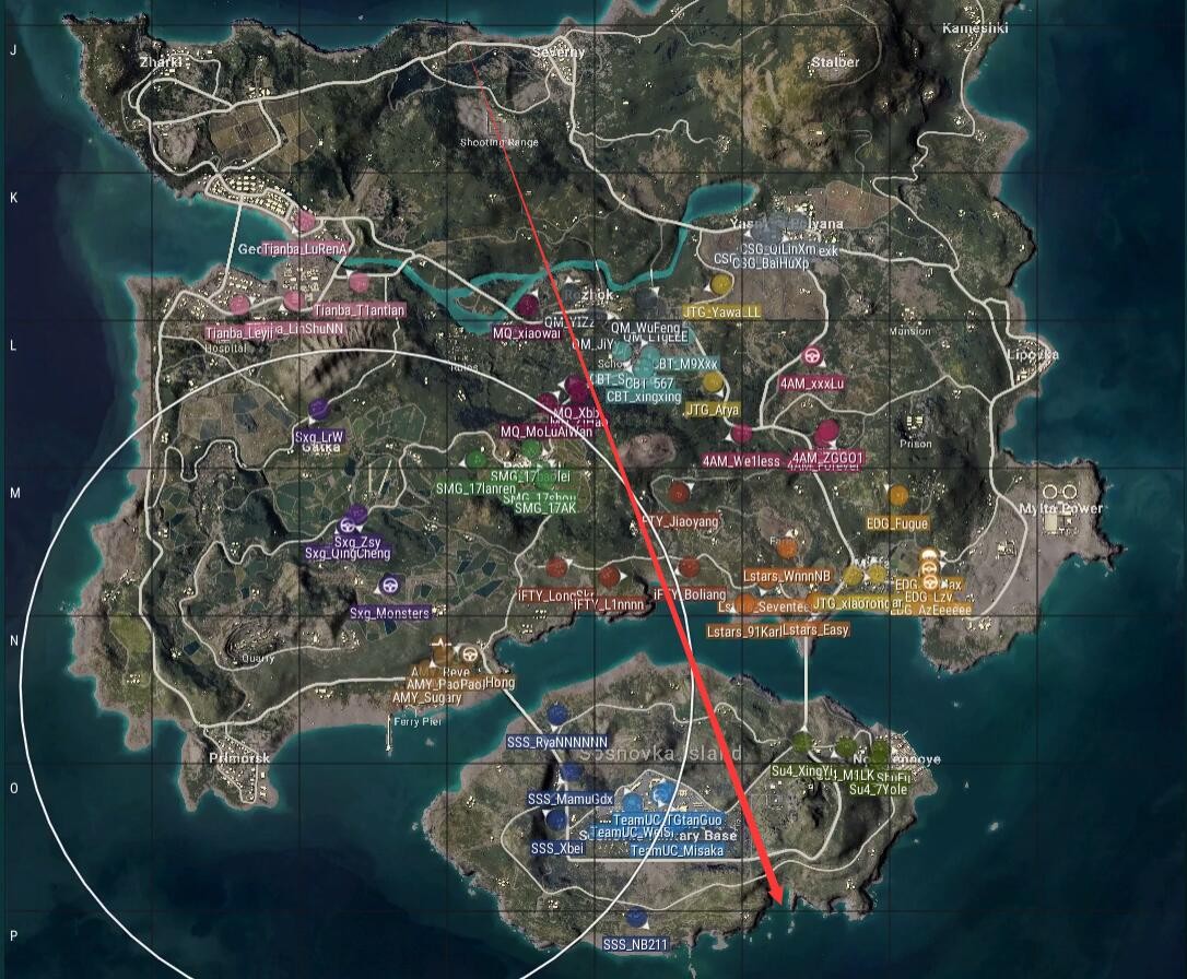 本局比赛采用海岛图,飞机从左上往右下,从G港飞往N港。4AM去往防空洞,SSS选择了机场,SMG选择了P城,安全区刷在了地图下方,是一个阴阳圈。