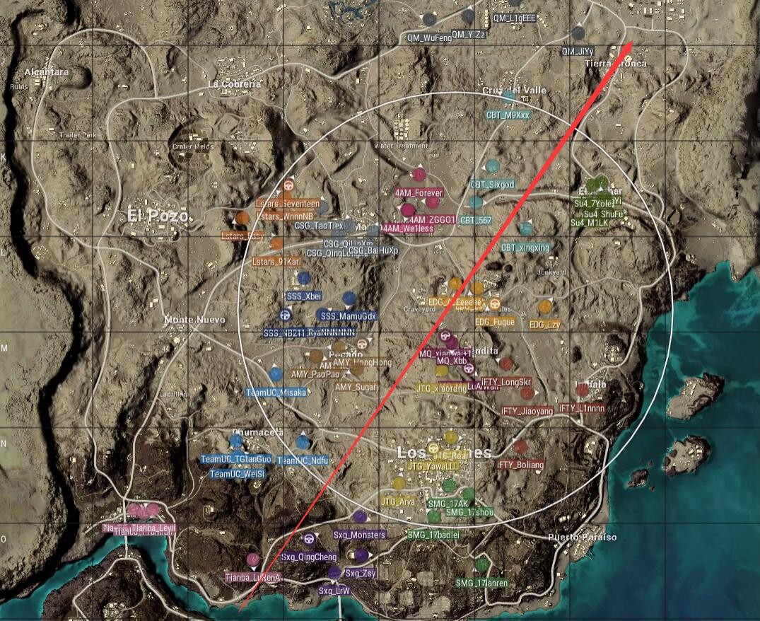 本局比赛采用沙漠图,飞机从左往右下,航线偏下。IFTY去往impala,4AM去往圣马丁右侧野区,UC选择了轴承高地,安全区刷在了地图右侧。