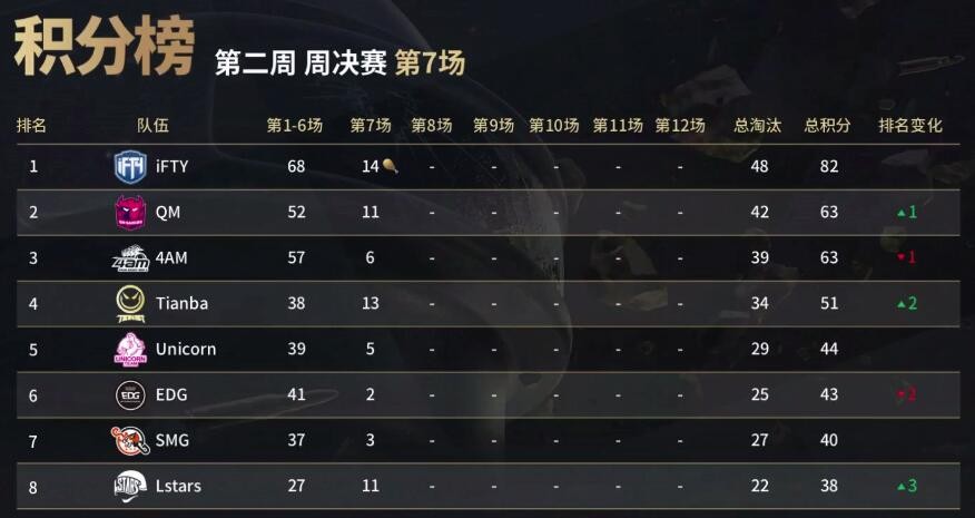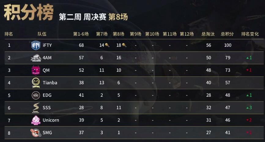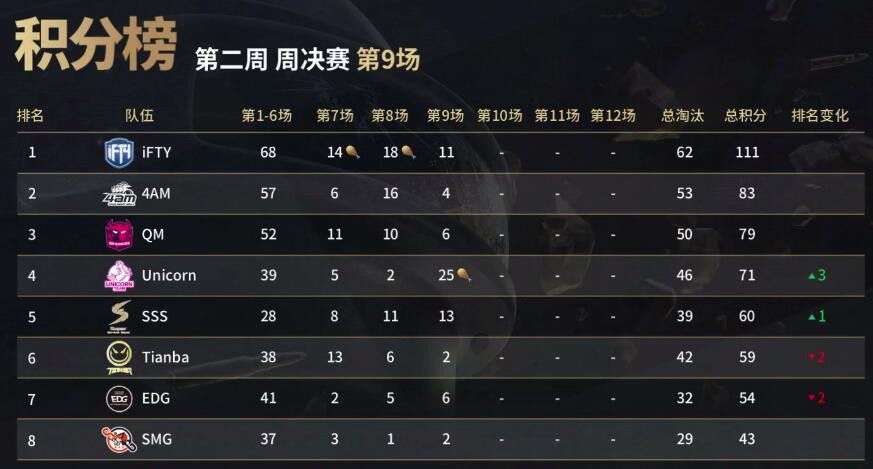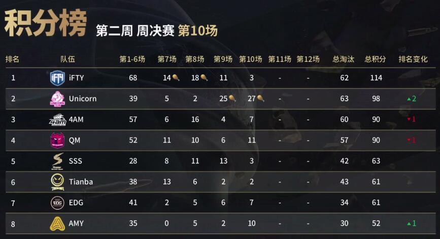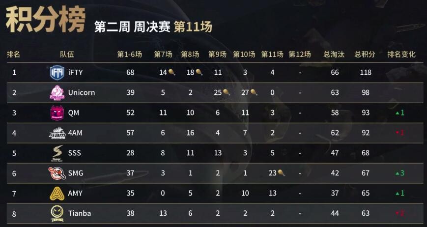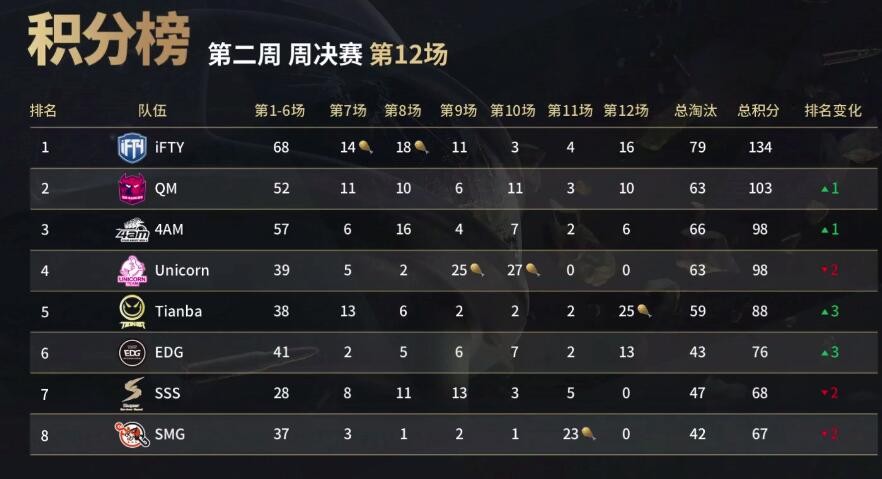 第二周周决赛全部结束,最终恭喜IFTY战队以134分夺冠,QM战队以103分夺得亚军,4AM战队以98分夺得季军。