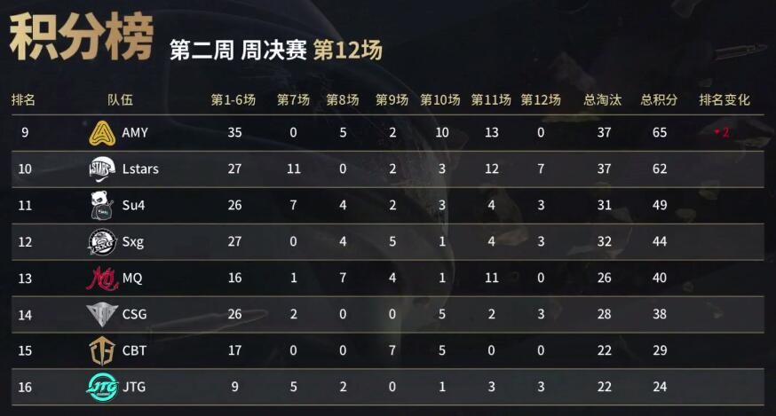 决赛圈场上还剩5队11人。Sxg被MQ带走,MQ独狼被SMG淘汰。蓝圈刷往梅花桩,baolei率先放倒一人,Lstars独狼也被带走,AMY残编被SMG依靠人数优势淘汰,SMG成功吃鸡!