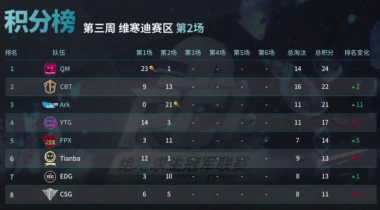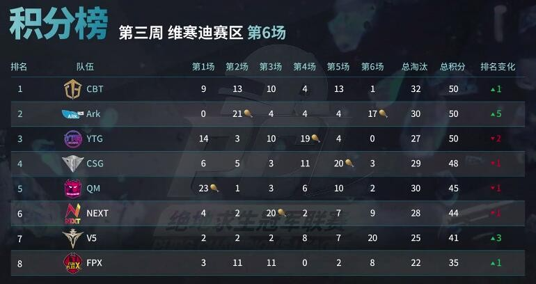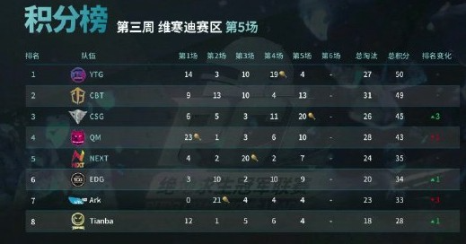 维寒迪第三周比赛全部结束,最终恭喜CBT、Ark、YTG、CSG、QM这五支队伍成功晋级周决赛。