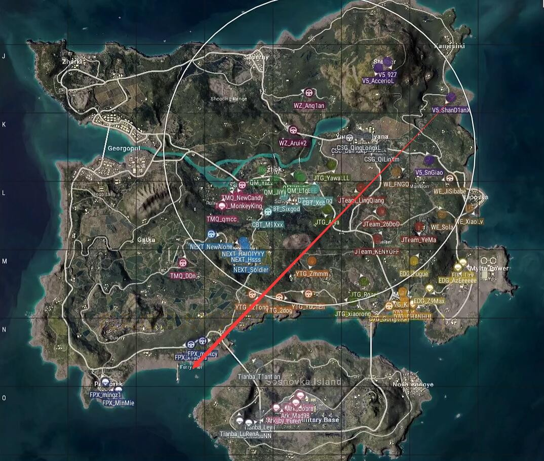 本局比赛采用海岛图,飞机从右上往下,从K镇飞往机场岛西部,航线略偏右,QM仍然选择了R城,WE选择了L港,YTG选择了二狗家,安全区刷在了地图下方,仍然包含整个机场岛。