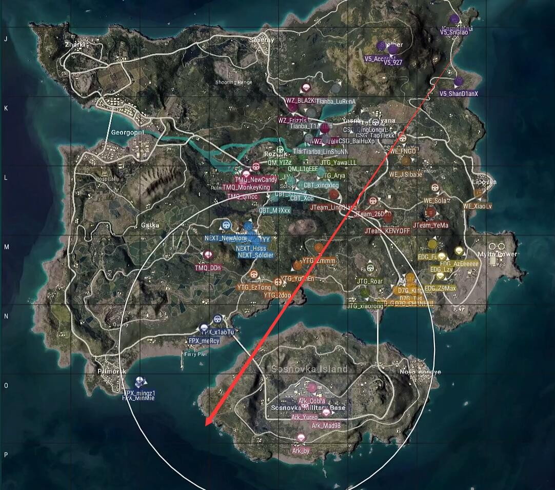 本局比赛采用海岛图,飞机从下往右上,航线偏右下,非常极端。Ark去往机场,QM去往R城,D7G去往M镇,安全区刷在了地图下方,包含整个机场岛。