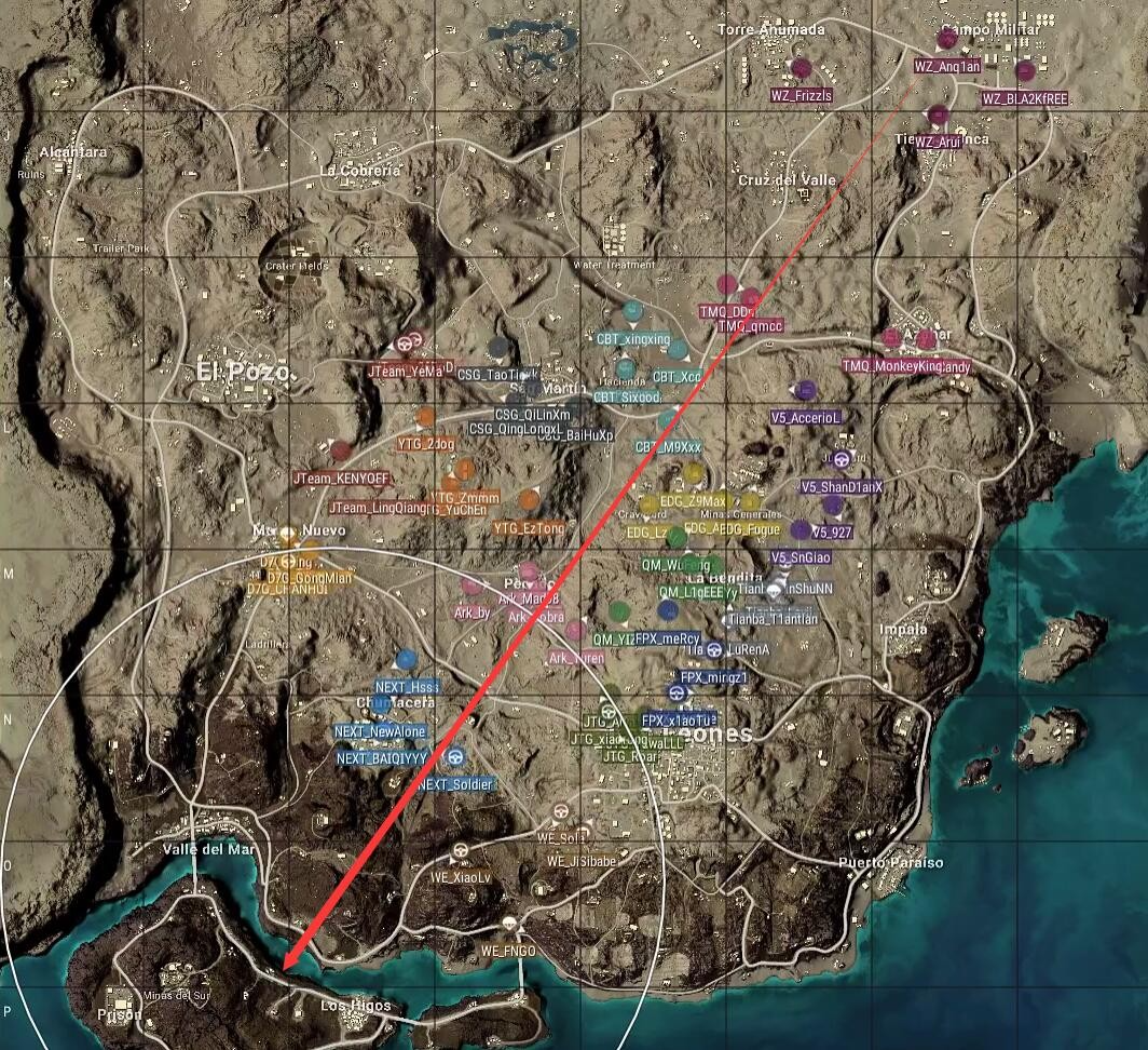 本局比赛采用沙漠图,飞机从左上往右,航线偏上。Ark与NEXT都选择了皮卡多,JTG去往狮城,CSG选择了圣马丁,安全区刷在了地图左侧。