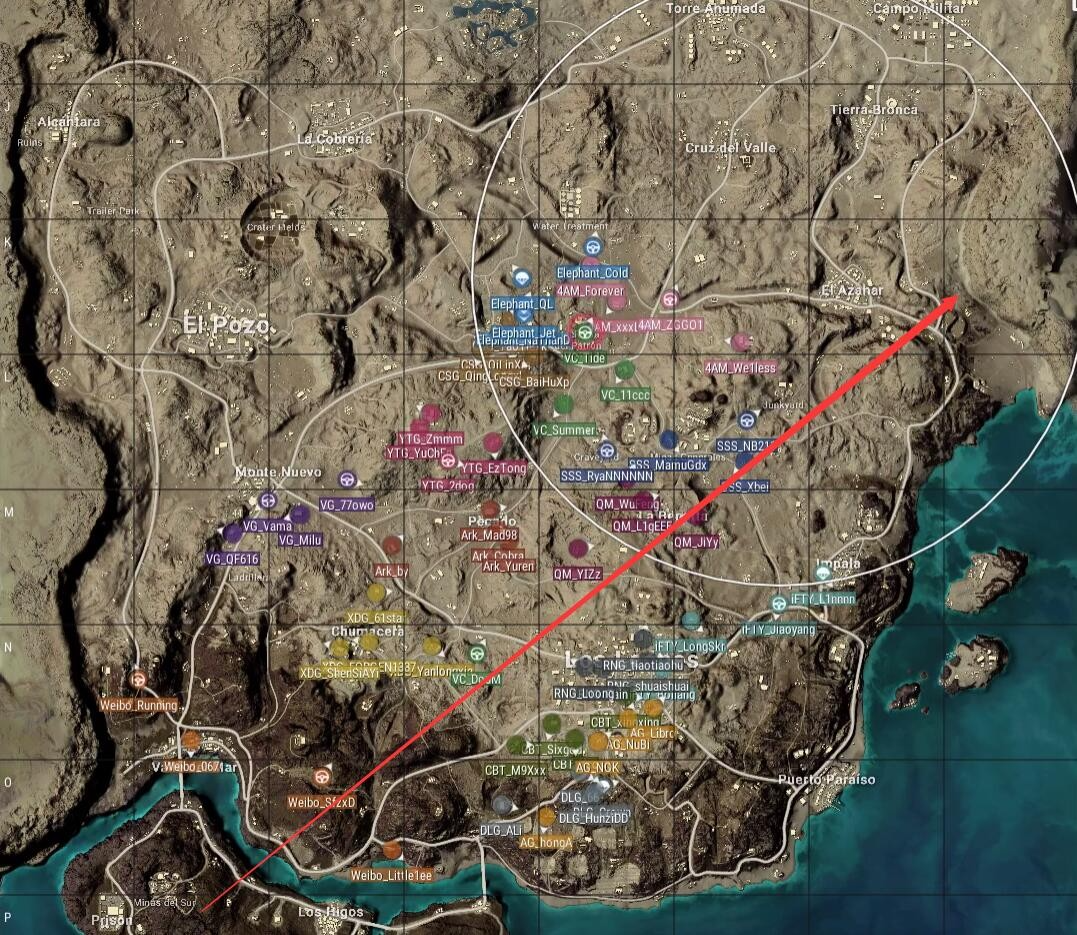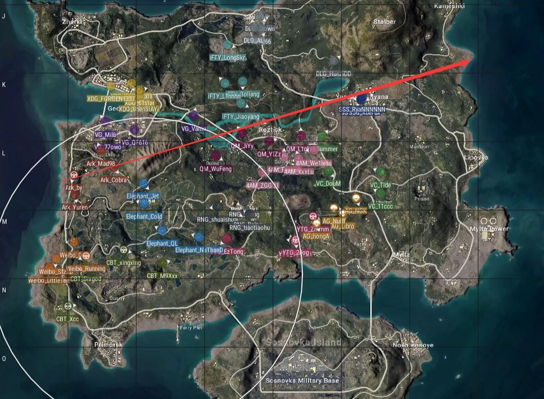 本局比赛采用海岛图,飞机从右下往左上,从大电厂飞往Z镇,航线略偏上。4AM去往学校,VC选择了防空洞,Ark选择了N港,安全区刷在了地图右侧,比较极端。