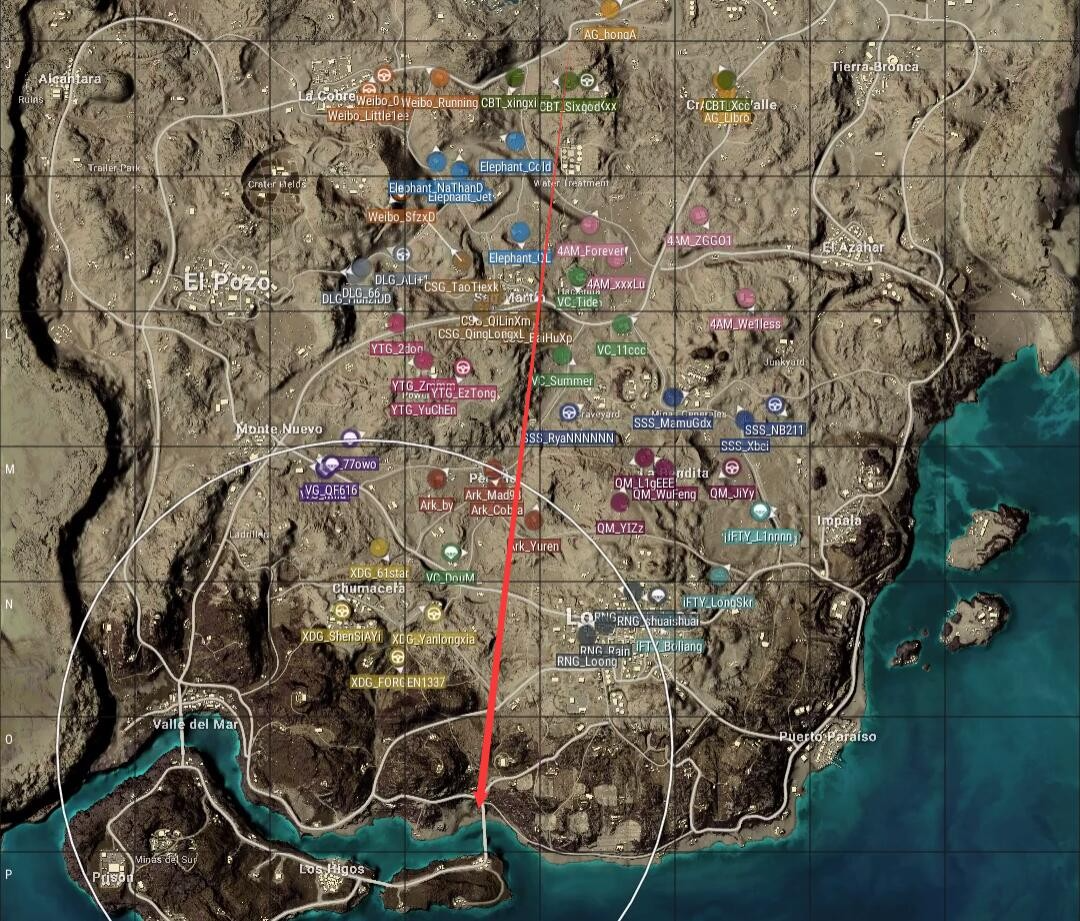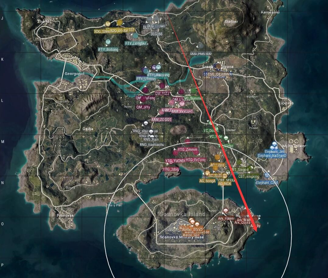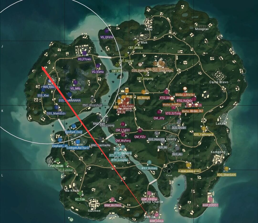 本局比赛采用海岛图,飞机从上往右下,从S城右侧飞往N港,航线略偏右。Ark再次去往N港,VG拿车去往G港,YTG去往二狗家,安全区刷在了地图下方,是一个机场圈。