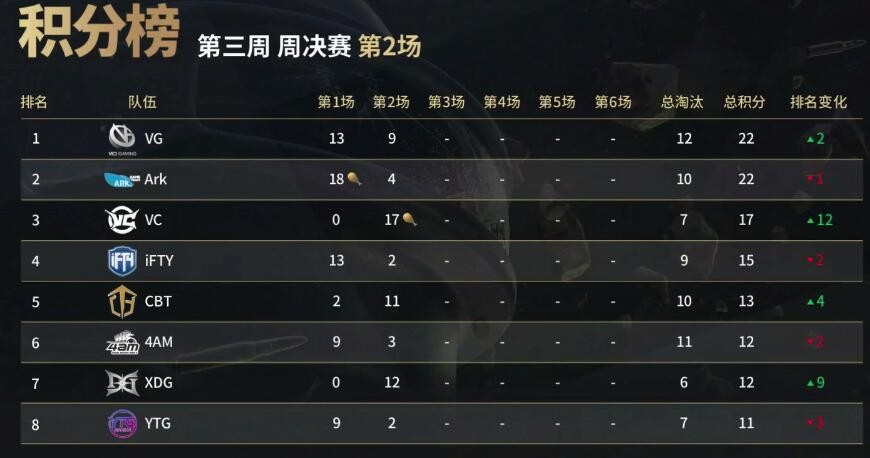 决赛圈场上还剩6队16人。VG在圈边淘汰AG,067被Longskr带走,YTG进圈被VG带走,IFTY独狼也被Ark带走。决战时刻,VG与Ark正面对决,by与98都选择伏地,by放倒77,自己在圈边倒地,最终98淘汰milu,Ark成功拿下首鸡!
