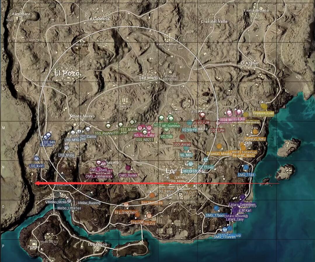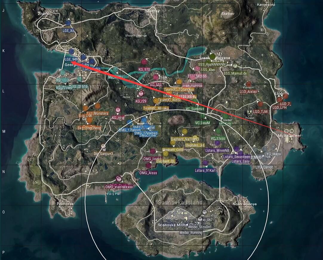 本局比赛采用海岛图,飞机从左往右下,从西部海岸飞往N港上方,航线偏下,略显极端。Weibo仍然去往机场,Sxg选择了G镇,LGE则开车去往G港上城区,安全区刷在了地图左侧,以龙脊山为中心。