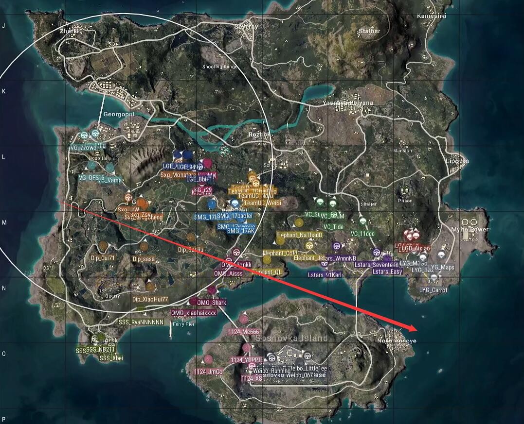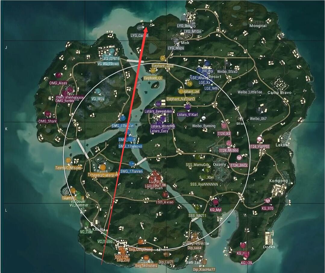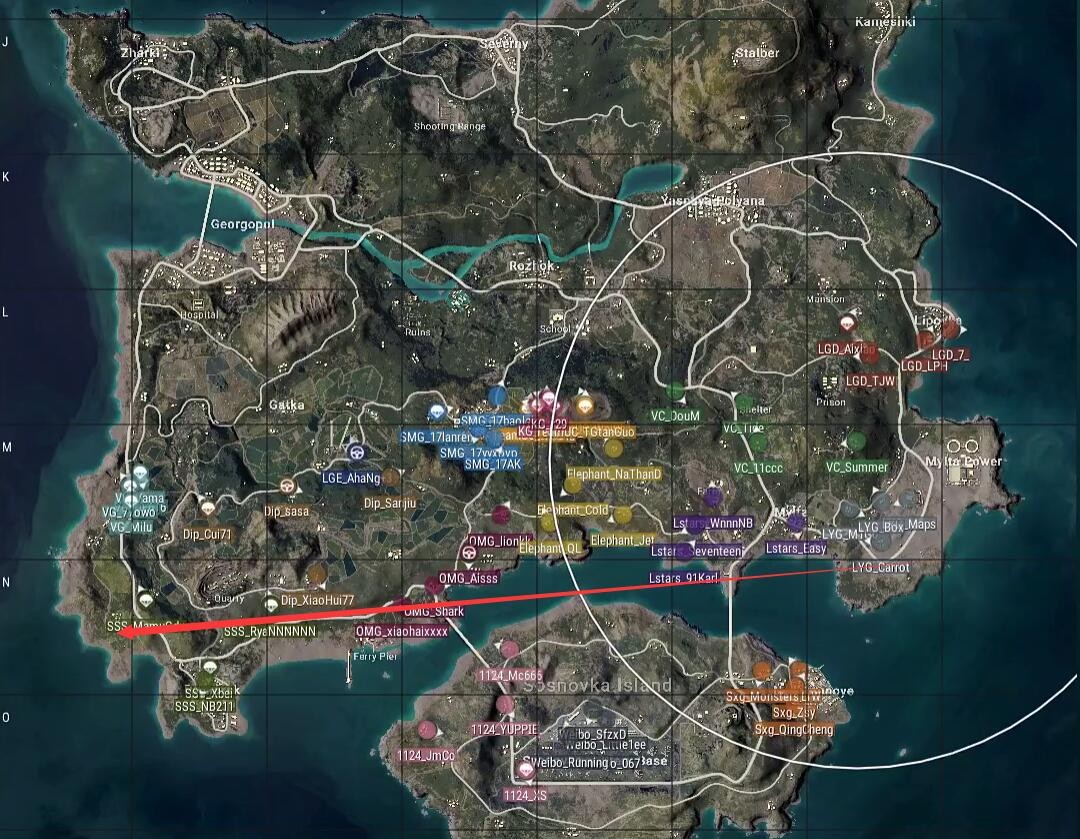 本局比赛采用海岛图, 飞机从右往左上,从大电厂飞往G港,航线略偏上。Weibo仍然选择机场作为跳点,KG选择了R城及附近野区,SSS选择了Y城,安全区刷在了地图下方,包含了整个机场岛。