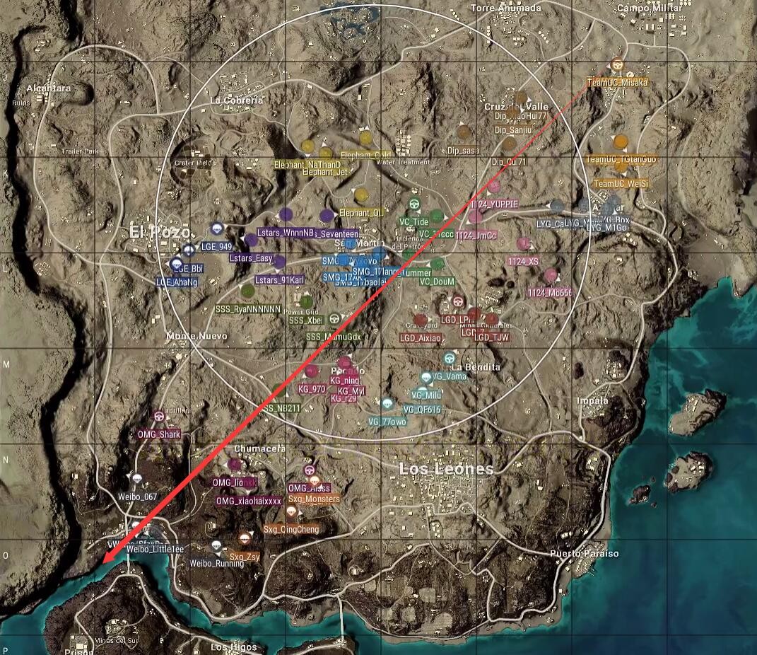 本局比赛采用海岛图,飞机从右往左,从小电厂飞往矿山,航线偏下非常极端。OMG去往渔村及十二宫,SMG选择了P城,Weibo选择了机场,安全区刷在了地图右侧,以监狱附近为中心。