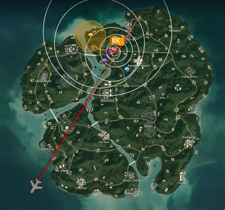 本局比赛采用雨林图,飞机从右上往左下,航线偏左略显极端。安全区刷在了地图上方,包含小半海域。