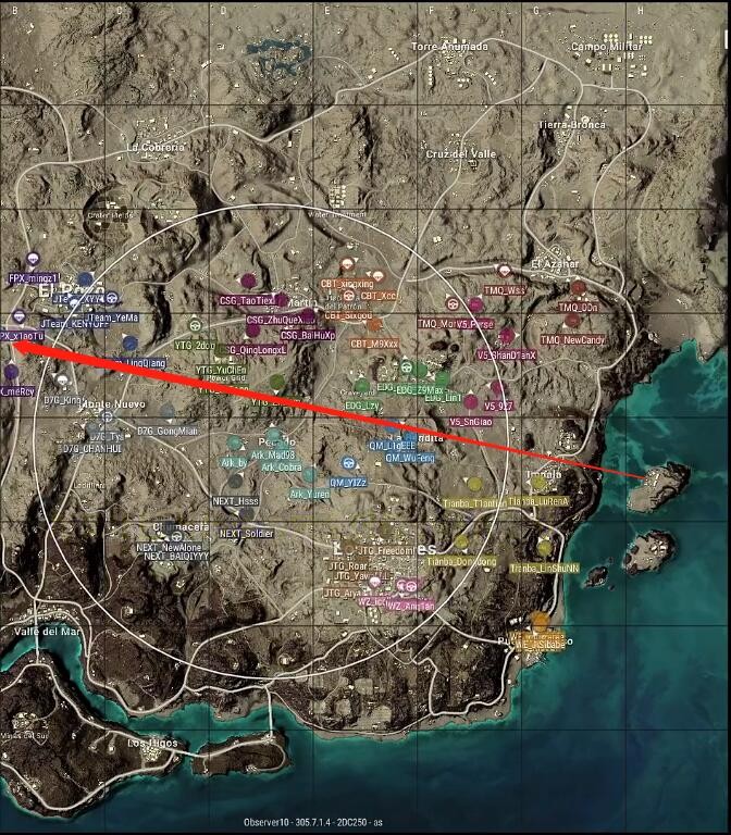 本局比赛采用沙漠图,飞机从左往右,航线偏下非常极端,安全区刷在了地图左上方,以大E城为中心。
