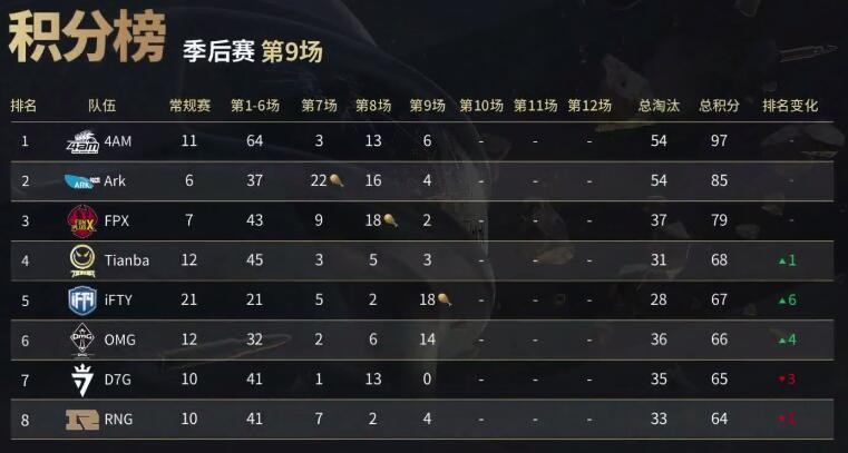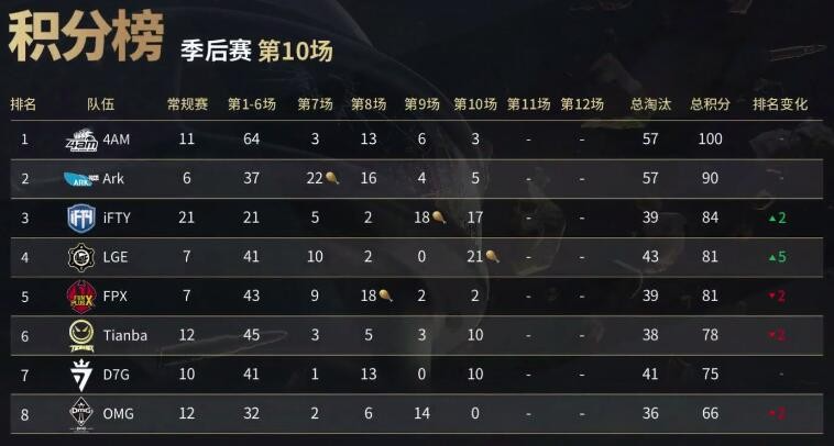 第二日比赛全部结束,积分方面4AM战队以112分领跑,Ark战队以107分暂居第2,iFTY战队以102分暂居第3。