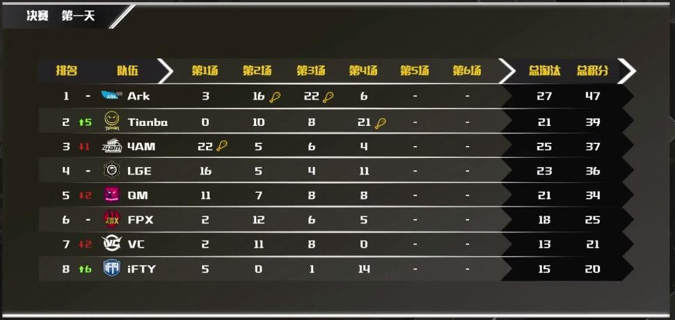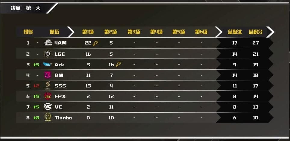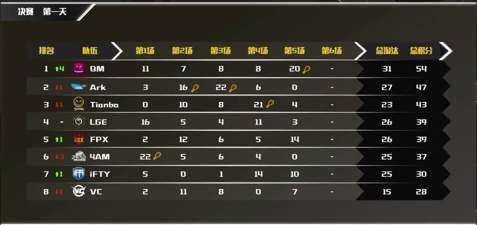 PCM决赛首日比赛全部结束,Tianba发挥出色领跑,目前Tianba、QM、Ark分列前三。