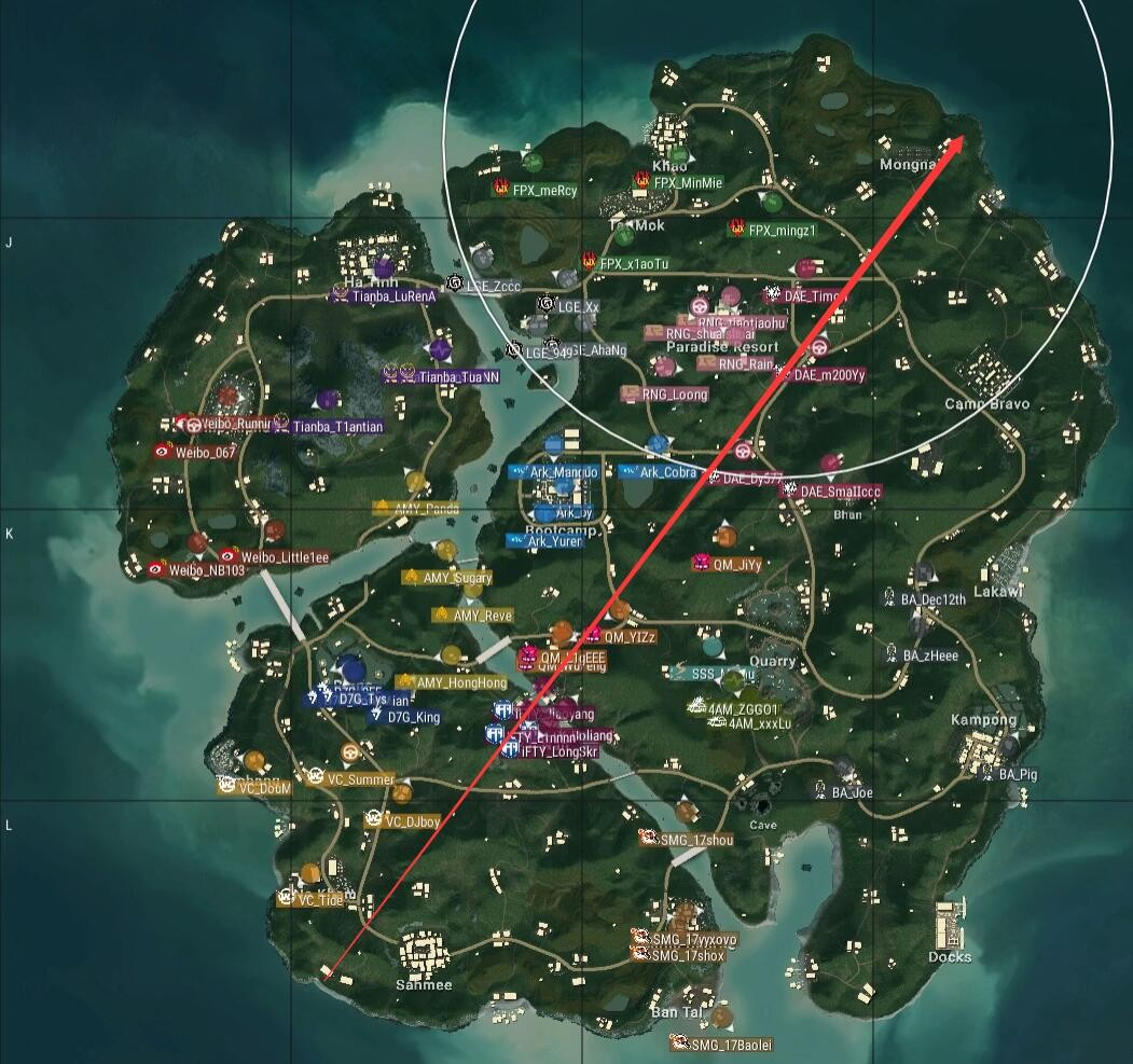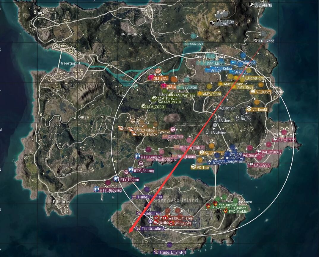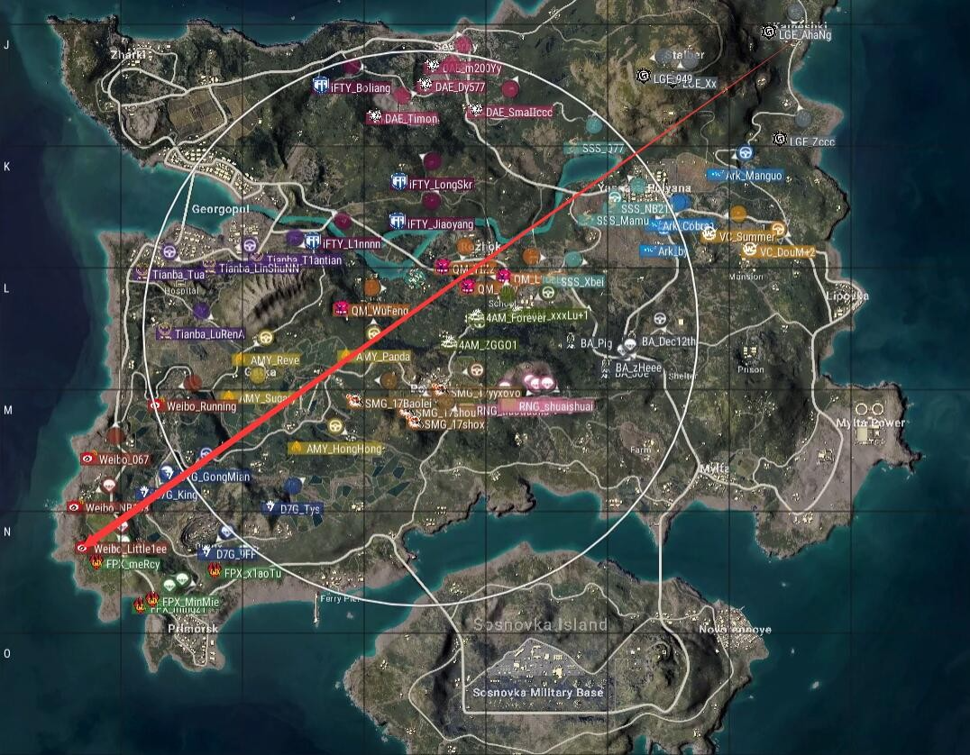 本局比赛采用海岛图,飞机从右下往左上,从N港上方飞往Z镇,航线非常平均。4AM去往学校,SMG去往P城,FPX去往N港,安全区刷在了地图中部,以学校为中心。
