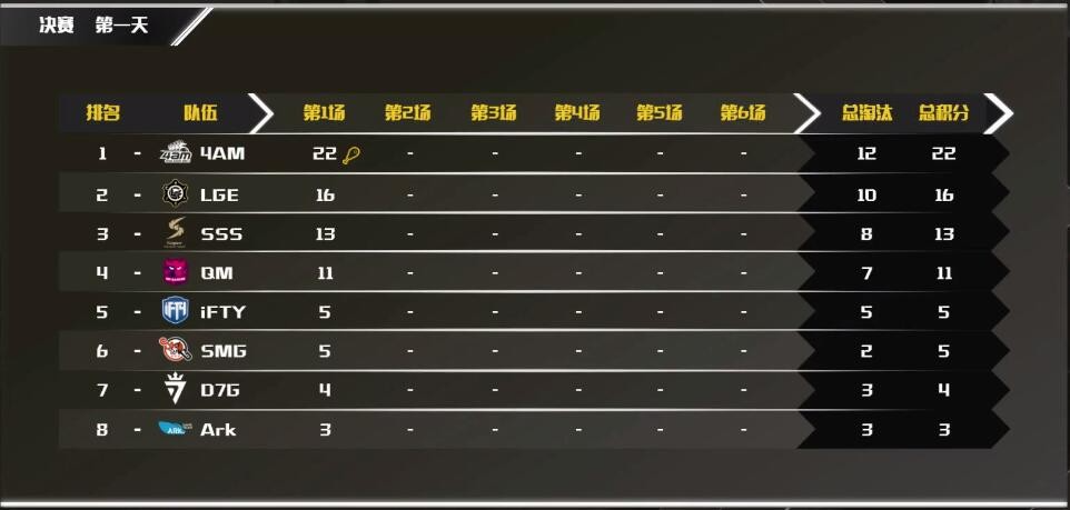 决赛圈场上还剩6队18人。Dae被SSS卡死在圈外,QM淘汰了SMG独狼shox。SSS进圈与LGE火拼,4AM协助淘汰LGE数人。QM独狼反杀SSS一人后出局,SSS位置被4AM发现淘汰,LGE独狼也被发现带走,4AM成功拿下首鸡!