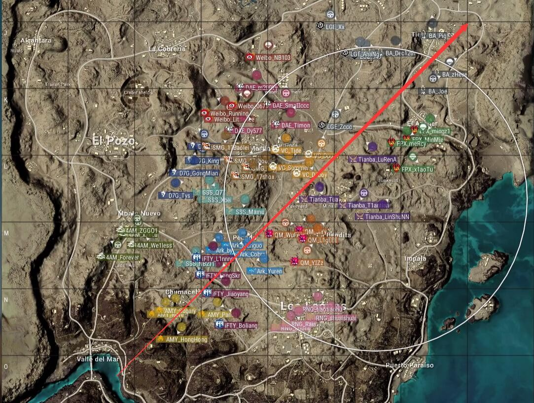 本局比赛采用沙漠图,飞机从下往上,航线偏左略显极端。SMG去往圣马丁,Ark去往皮卡多,4AM去往大E城下方资源点,安全区刷在了地图左侧。