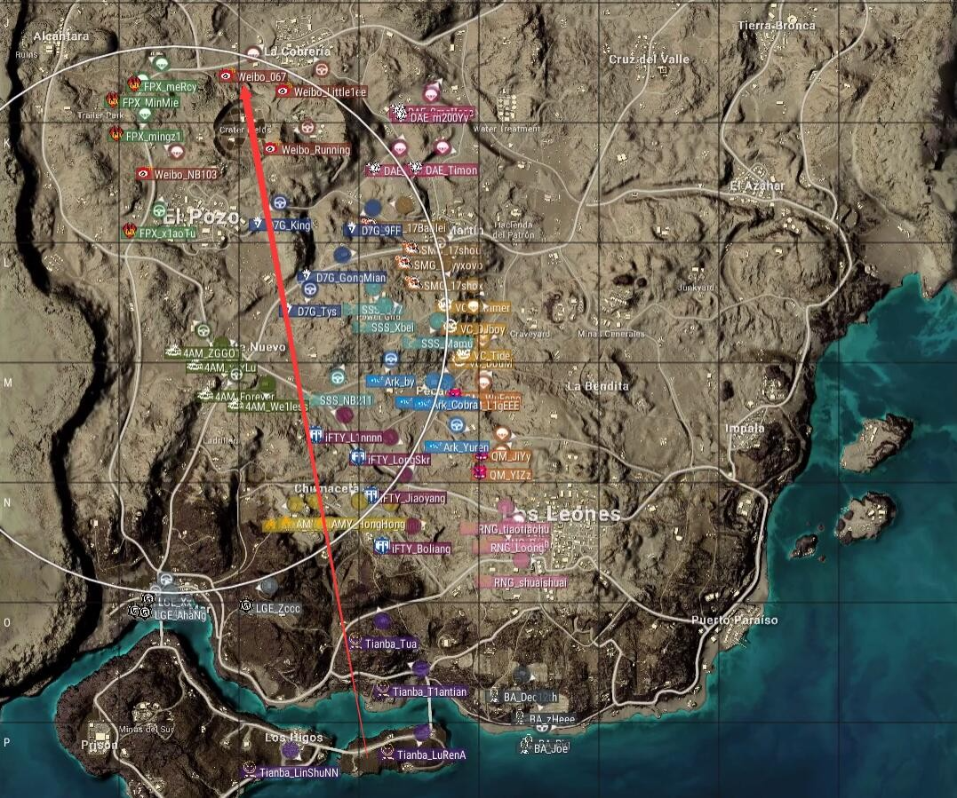 本局比赛采用沙漠图,飞机从左下往右上,航线非常平均。FPX去往小E城,RNG去往狮城,Ark去往皮卡多,安全区刷在了地图右侧。