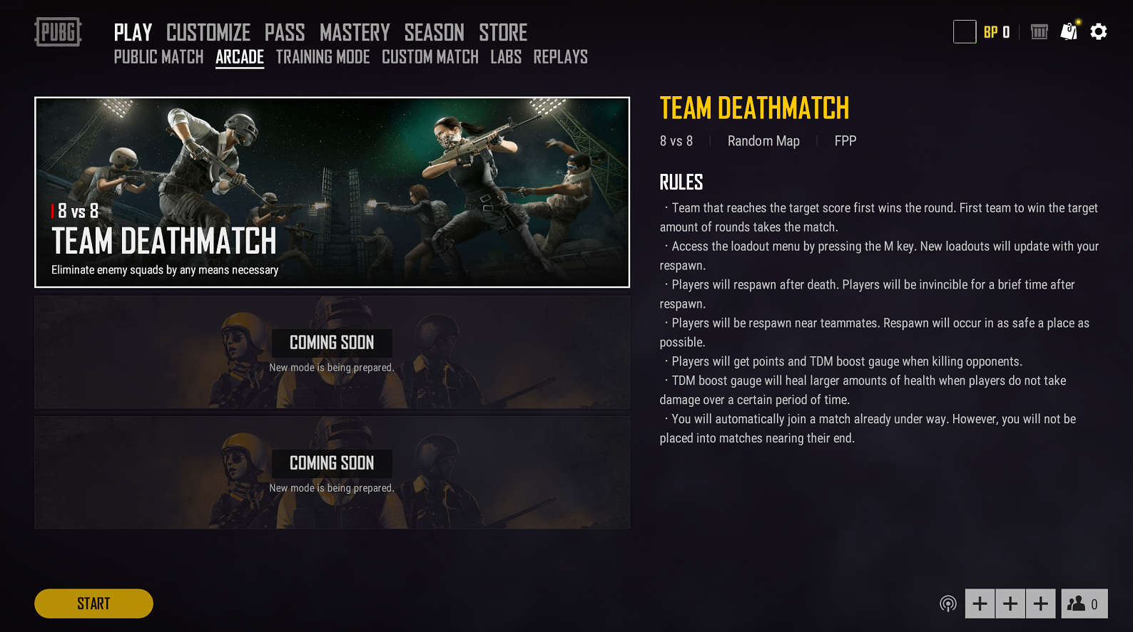 为了给玩家们带来一个使用PUBG专属系统、保留PUBG独有的枪战特色、具有别样的趣味性、完成度高的团队淘汰竞赛,我们为之投入了大量的努力。PUBG版团队淘汰竞赛将从已有的地图中选出7个战地,并在此展开一场激烈的8v8对战。独有PUBG枪战和游戏玩法的基础上,玩家们通过不断地战斗/重生并能体验到全新的游戏乐趣。