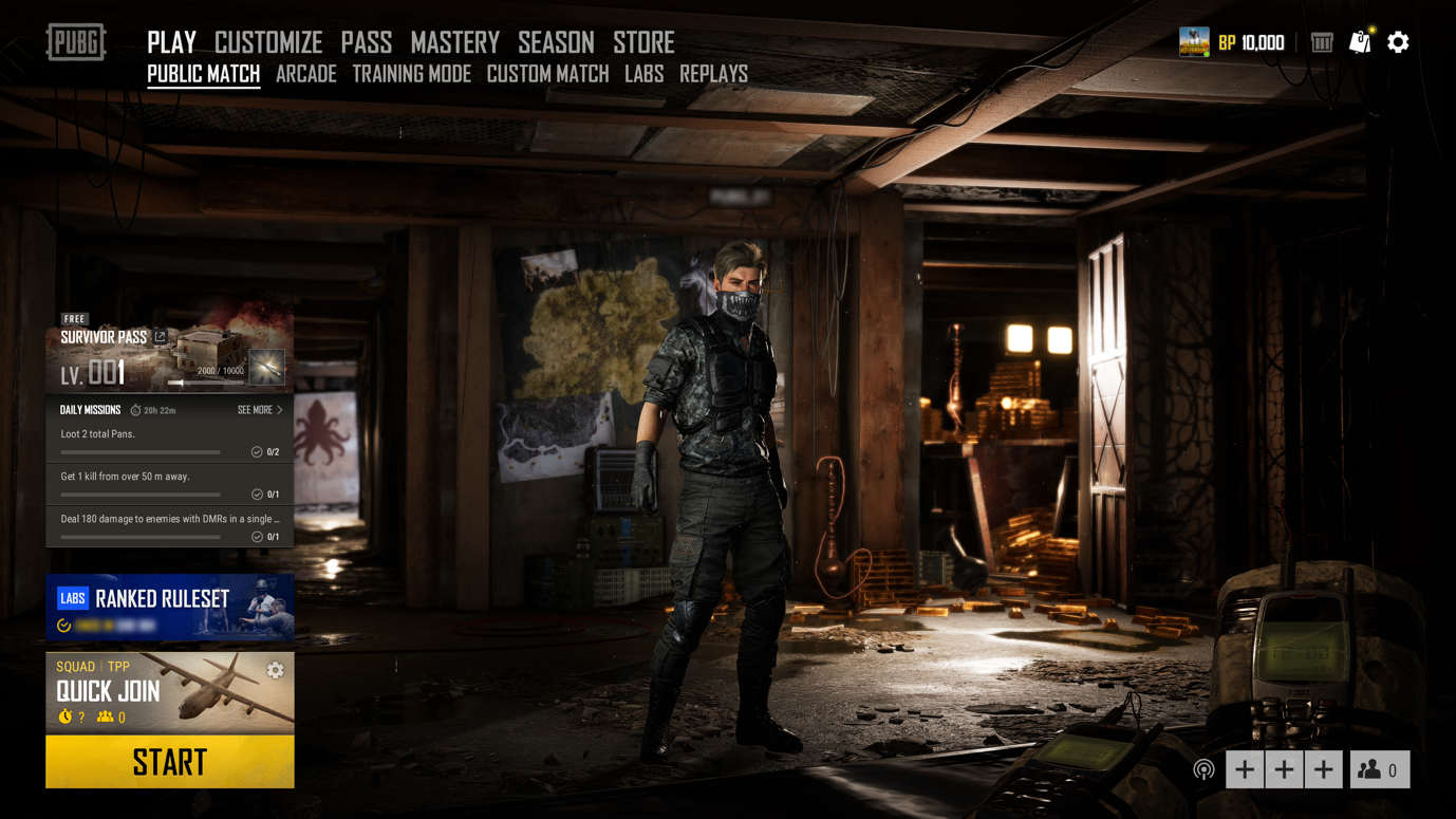 点击【开始】上方的【PUBG实验室】蓝色banner即可体验PUBG实验室竞技比赛游戏规则测试。