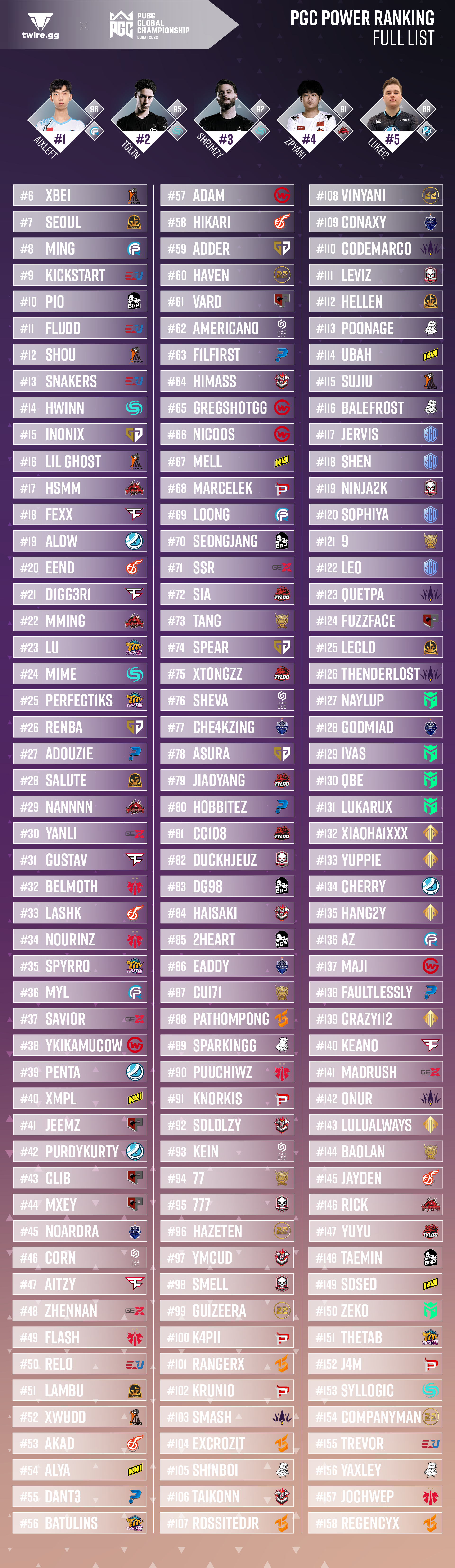 让我们来看看独家的PGC战力值排名,该排名只包括参加PGC2022的选手。PGC战力值排名的参考为常规实力排名和队员在过去一年中主要赛事的综合表现。