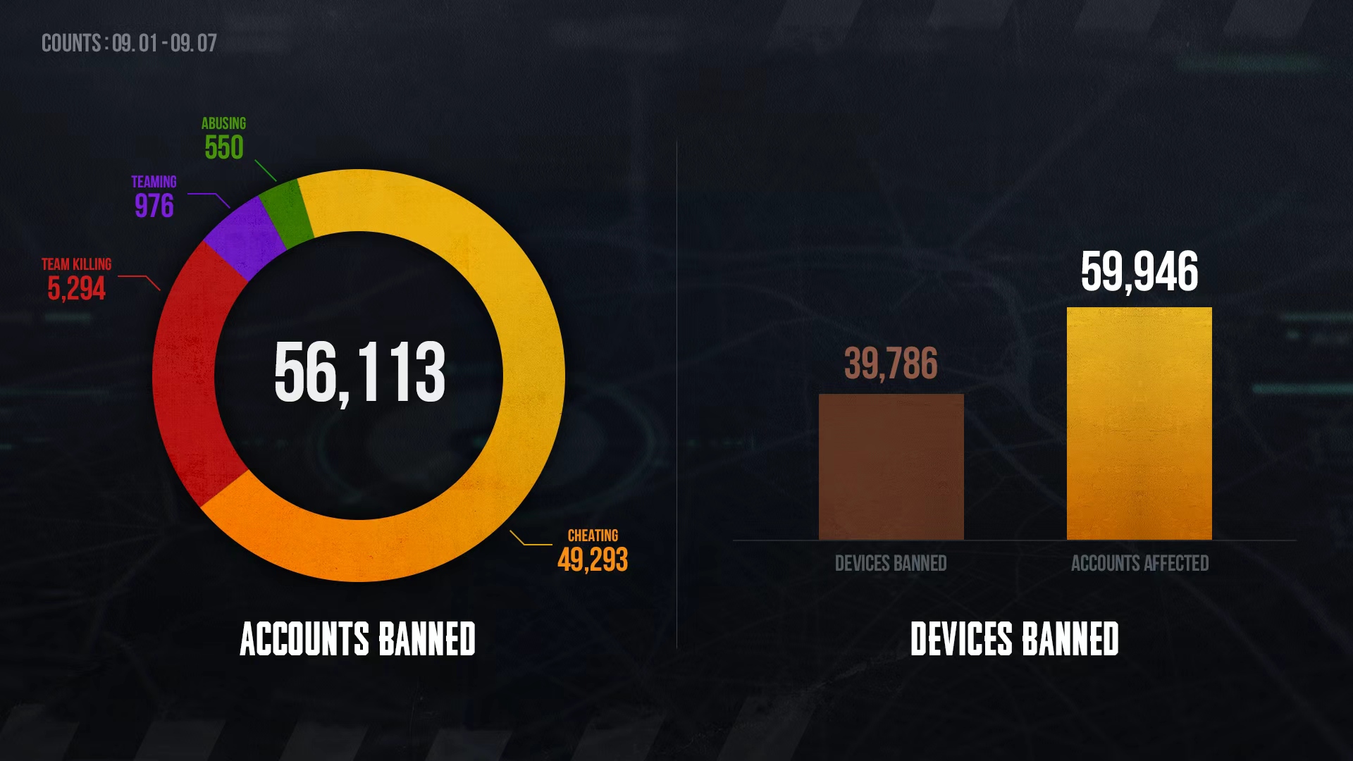 9月1日 至 9月7日 期间,共计对56,113个违规账号进行了封禁,其中49,293个账号因使用外挂被永久封禁。