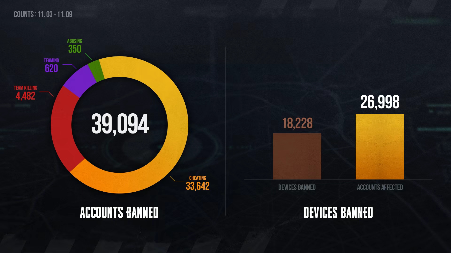 11月3日 至 11月9日期间,共计对39,094违规账号进行了封禁,其中33,642个账号因使用外挂被永久封禁。