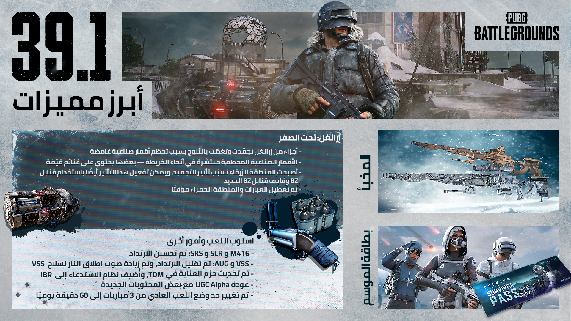 يجلب التحديث 39.1 شتاءً قاسيًا إلى Erangel، ساحة المعركة الأكثر شهرة في PUBG. تتطلب كل من المنطقة الزرقاء، التي تحمل تأثير التجميد الآن، بالإضافة إلى الأنهار المتجمدة والتضاريس وظروف الطقس المتغيرة، اتخاذ قرارات سريعة وتكيفًا مستمرًا من اللاعبين. سيُقدم عبور المياه المتجمدة لفتح مسارات جديدة أو الاشتباك في معارك نارية حول المواقع المغطاة بالثلوج، مواقف قتالية تبدو جديدة كليًّا. يضيف قاذف القنابل اليدوية BZ إمكانيات تكتيكية جديدة، مما يسمح للاعبين بملائمة نهجهم اعتمادًا على سير المعركة. هذا التحديث هو أكثر من مجرد تغيير بسيط في البيئة. صُمم هذا التحديث لإضافة حالة من التوتر التكتيكي وإحداث تنوع في مسارات السفر، والمواقع الرئيسية، واستراتيجية النجاة في جميع أنحاء إرانغل.