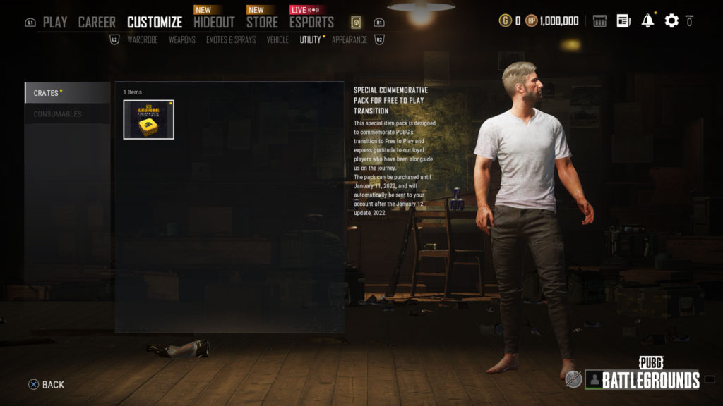 Ve a la TIENDA en el juego de PUBG: BATTLEGROUNDS – COMPLEMENTOS, luego selecciona PUBG: PAQUETE DE TRANSICIÓN A JUEGO GRATIS ESPECIAL.