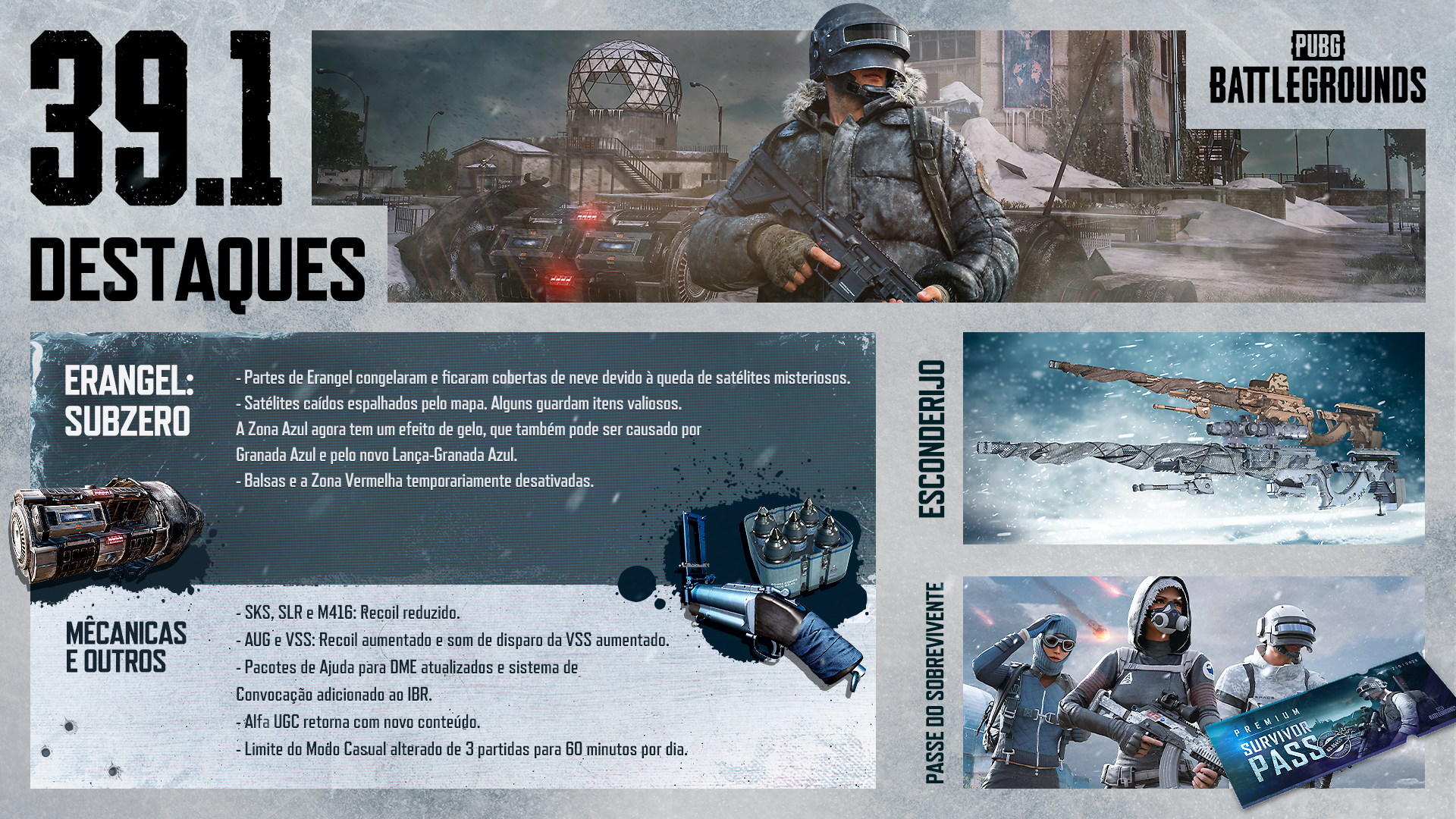 A atualização 39.1 traz um inverno rigoroso para Erangel, o battleground mais icônico do PUBG. A Zona Azul, agora com efeito de congelamento, junto com rios e terrenos congelados e condições climáticas variáveis, exige tomadas de decisão rápidas e adaptação constante dos jogadores. Atravessar águas congeladas para abrir novas rotas ou entrar em tiroteios em torno de posições cobertas de neve introduzirá situações de combate totalmente novas. O novo Lança-Granada Azul também adiciona novas possibilidades táticas, permitindo que os jogadores adaptem sua abordagem dependendo do andamento da batalha. Esta atualização é mais do que uma simples mudança ambiental. Ela foi projetada para adicionar tensão tática e trazer variedade às rotas de viagem, posições-chave e estratégia geral de sobrevivência em Erangel.