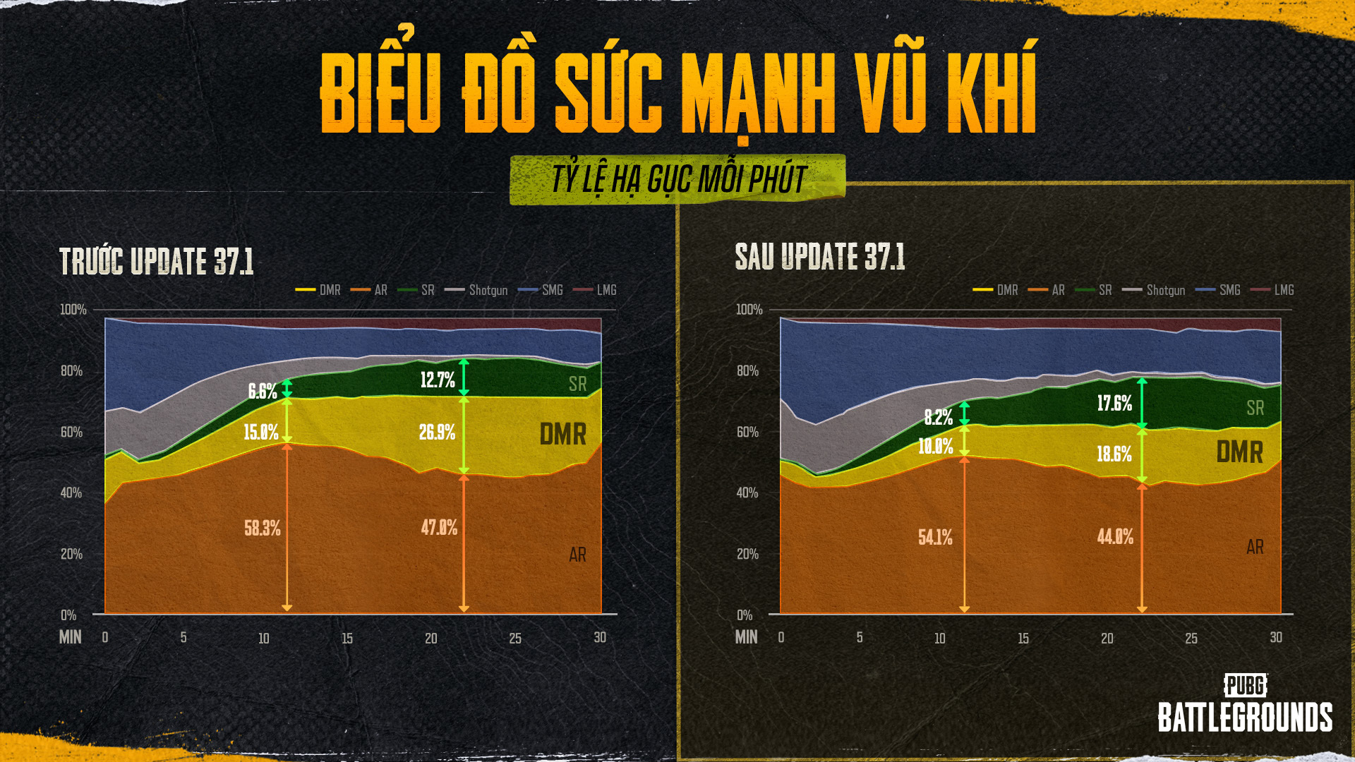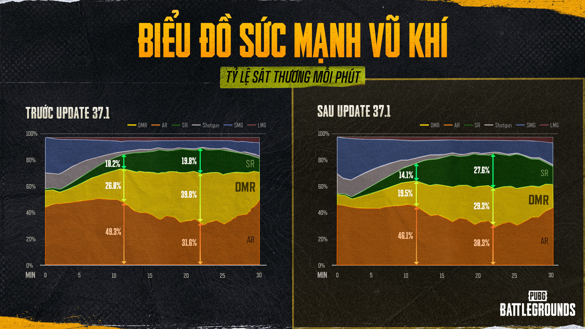 Biểu đồ tỷ lệ sát thương mỗi phút cho thấy xu hướng tương tự. Trước khi tái cân bằng DMR, tỷ lệ sát thương ở giai đoạn giữa đến cuối của AR, DMR và SR lần lượt là 31.6%, 39.8% và 19.8%, nghĩa là DMR gây ra sát thương nhiều hơn gấp đôi so với SR. Tuy nhiên, sau khi cập nhật, tỷ lệ trở thành AR 30.3%, DMR 29.3%, SR 27.6%, cho thấy sự phân bổ đồng đều hơn nhiều. Điều này có nghĩa là DMR không còn chiếm ưu thế áp đảo về khả năng gây sát thương ở giữa đến cuối trận đấu nữa.