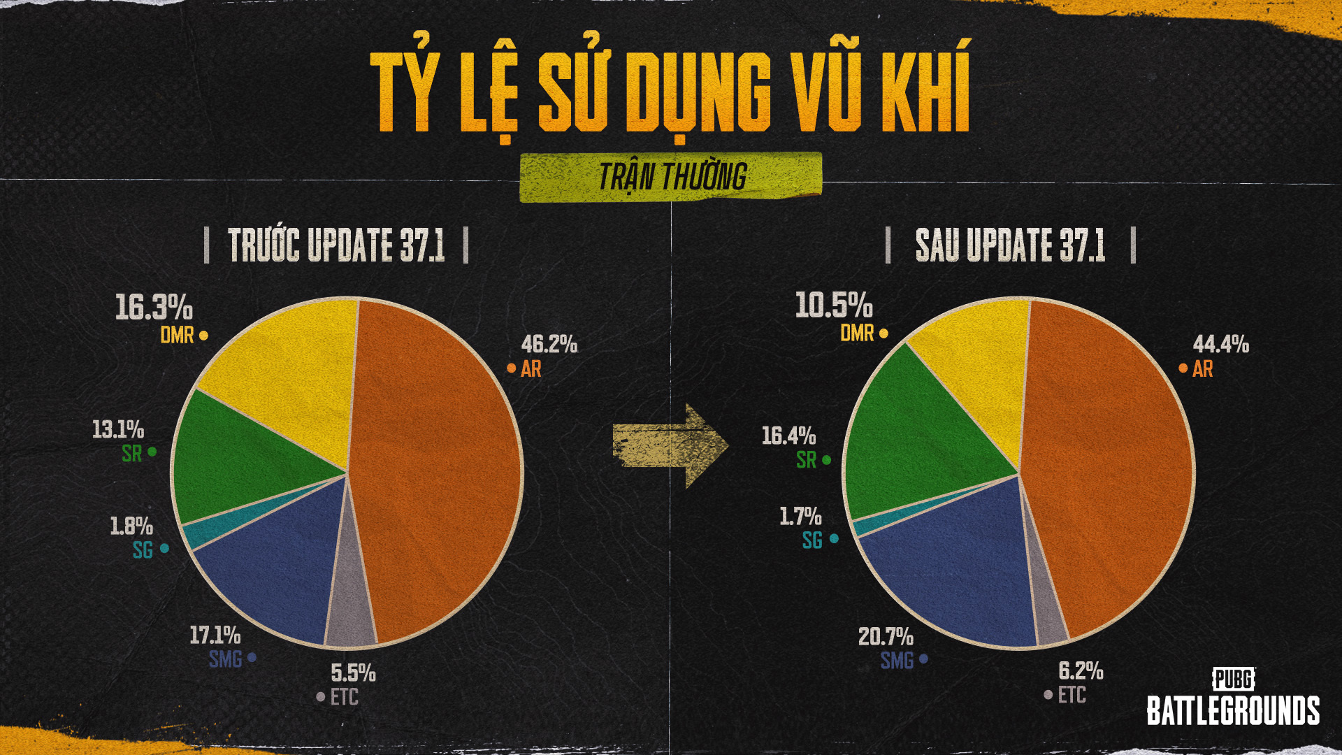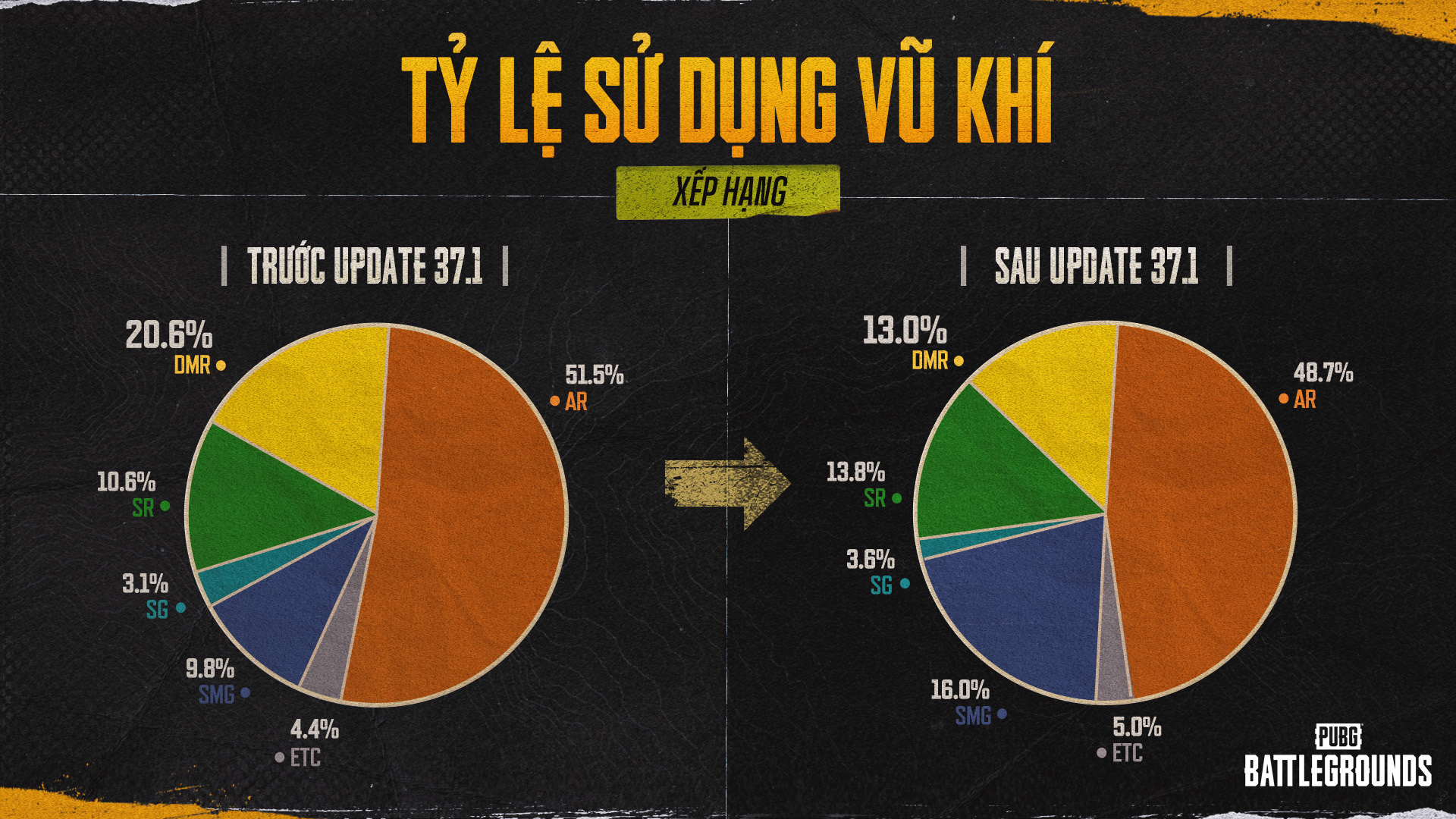 Sử dụng vũ khí là cốt lõi của PUBG và chúng tôi hiểu rằng người chơi luôn theo dõi sát sao sự phát triển của nó. Chúng tôi sẽ tiếp tục quan sát cẩn thận xu hướng sử dụng vũ khí hiện tại và cách người chơi tham gia chiến đấu, không ngừng tìm kiếm những cách thức để cải thiện trải nghiệm tốt hơn nữa.