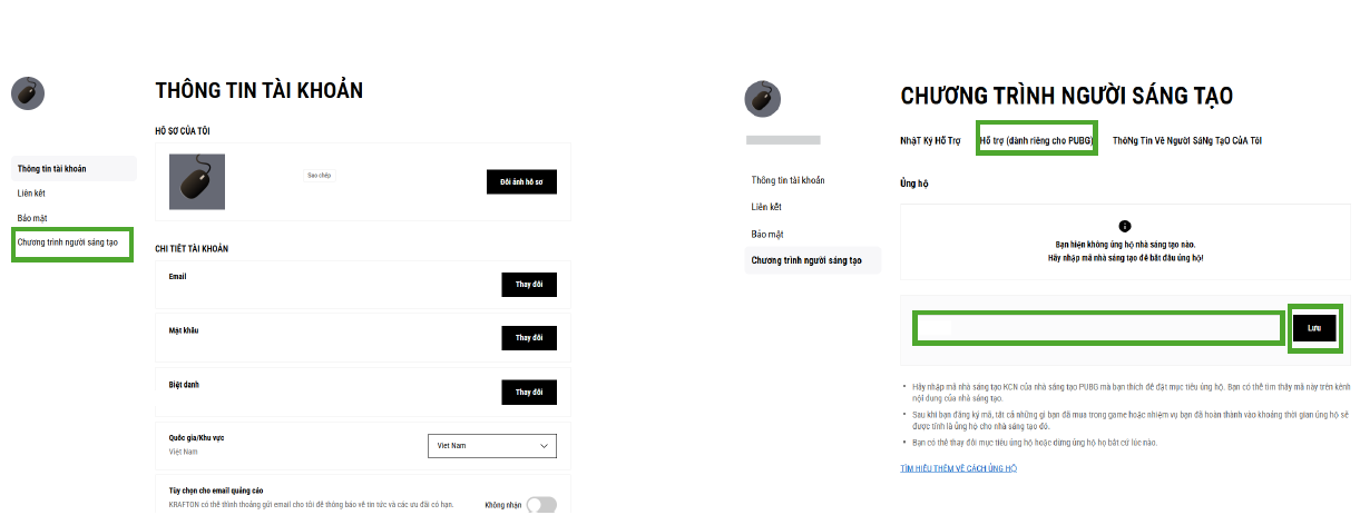 Để ủng hộ nhà sáng tạo bạn yêu thích thì trước hết bạn hãy sử dụng Mã Nhà Sáng Tạo (CREATOR CODE), sau đó bạn hãy mua G-Coin trong cửa hàng PUBG trong game trên các nền tảng: Steam, Epic Games, Xbox, PSN.