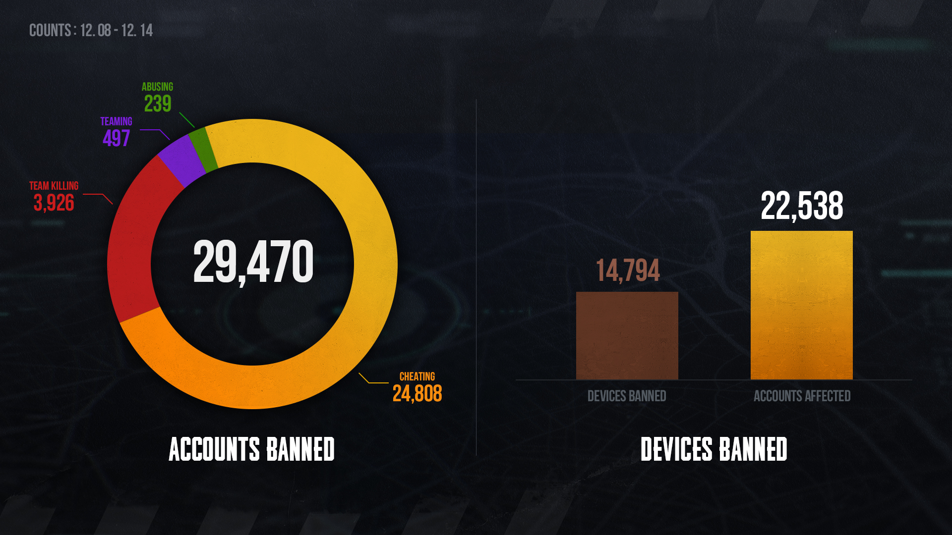 12月8日 至 12月14日期间,共计对29,470违规账号进行了封禁,其中24,808个账号因使用外挂被永久封禁。