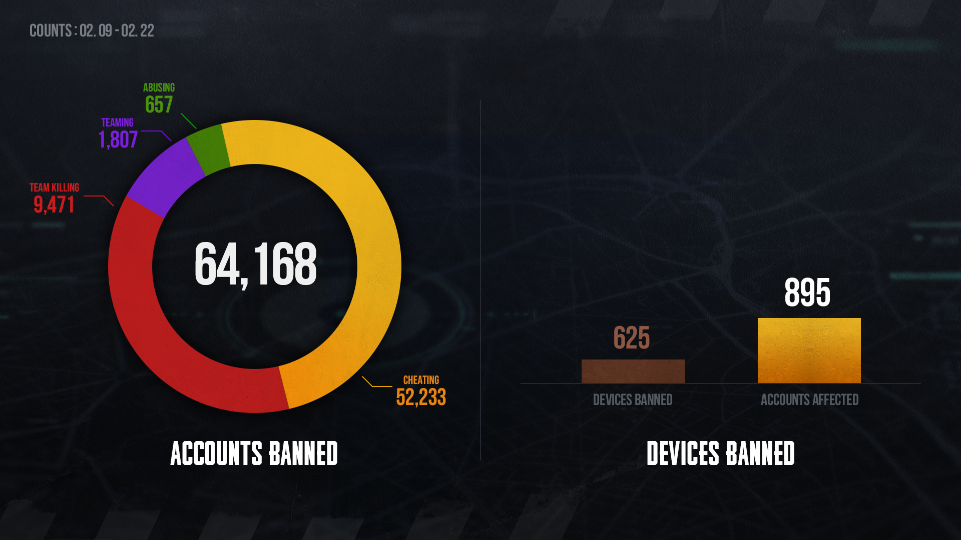 2月9日 至2月22日期间,共计对64,168违规账号进行了封禁,其中52,233个账号因使用外挂被永久封禁。