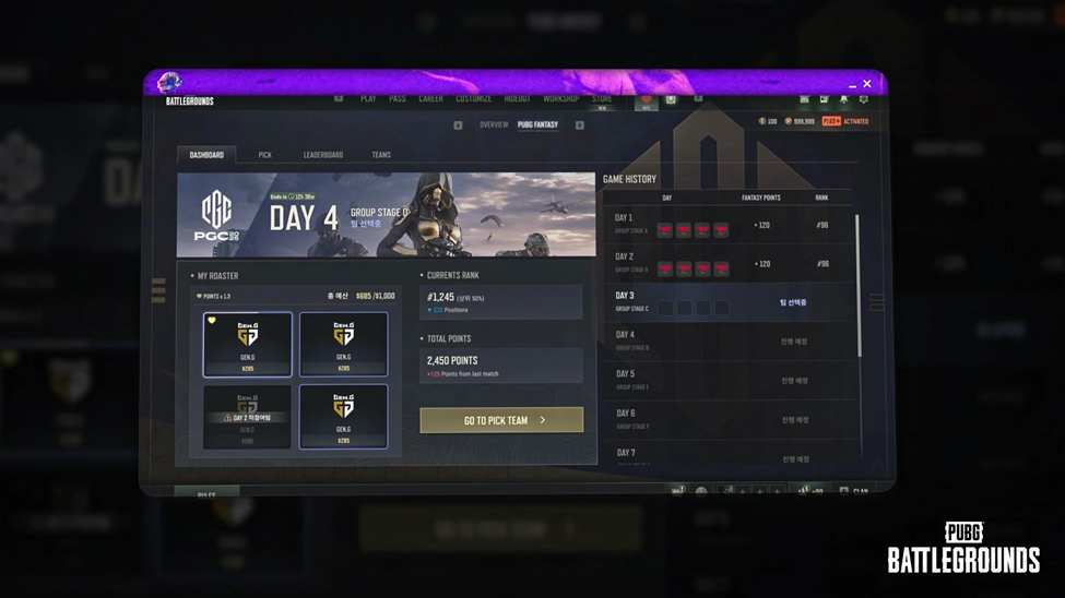 这是 PUBG 为电竞爱好者打造的梦幻联赛玩法,相信各位对此类玩法并不陌生。大家可以从众多战队中挑选四支战队组建专属阵容,参与全球排行榜的角逐。该玩法系统秉持公平设计原则,胜负取决于赛事分析与战术策略而非单纯的运气,还将根据排行榜排名提供丰厚的 G-Coin 奖励。